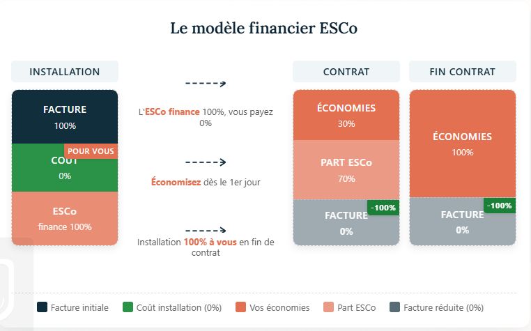Avec le modèle ESCO, ce CAPEX et ce recours à l’endettement disparaissent : Joya finance intégralement votre installation, et vous ne réglez qu’une charge mensuelle indexée sur vos économies réelles, aux alentours de 30 % mensuellement à partir du premier mois 📊.